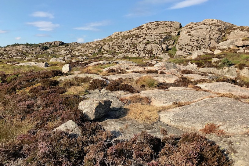Nächster Stopp, nach rund drei Kilometern sollte die Grasdalsheia sein, eine Erhebung, die rund 90 Meter über dem Meer lag. Von hier hatte ich einen herrlichen Blick über die gesamte Umgebung. Weit entfernt vom Lindesnes Fyr war ich ja nicht, obwohl ich den Eindruck hatte, schon mächtig was geschafft zu haben. Aber das lag schlicht an dem herausfordernden Weg, der volle Konzentration erforderte. Von nun an ging es nur noch bergab und wieder zurück Richtung Parkplatz.