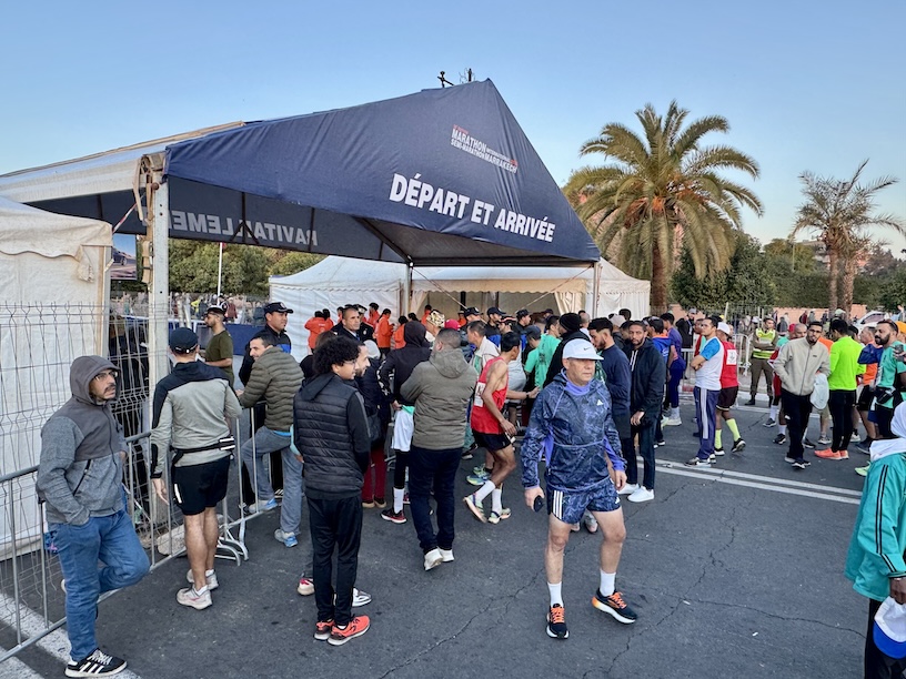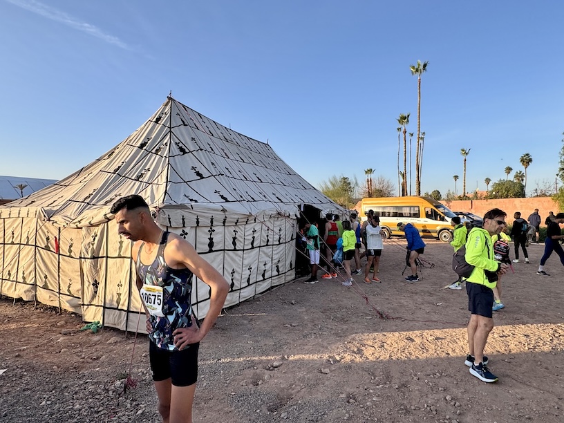 Der Startbereich auf der Av. Prince Moulay Rachid, gegenüber dem Hotel Sofitel Marrakesch, war sehr großzügig bemessen. Ich suchte zunächst die Gepäckaufbewahrung, von der auch nicht wirklich klar war, ob es die überhaupt gibt. Wenn es ganz dumm gelaufen wäre, hätte ich meine Tasche wieder ins Riad bringen müssen, um sie dann wieder zu holen. Den Rückflug hätte ich so direkt knicken können. Aber es gab ein Beduinenzelt, in dem ich meine Sachen deponieren konnte und insofern war dieses Problem erst einmal gelöst.