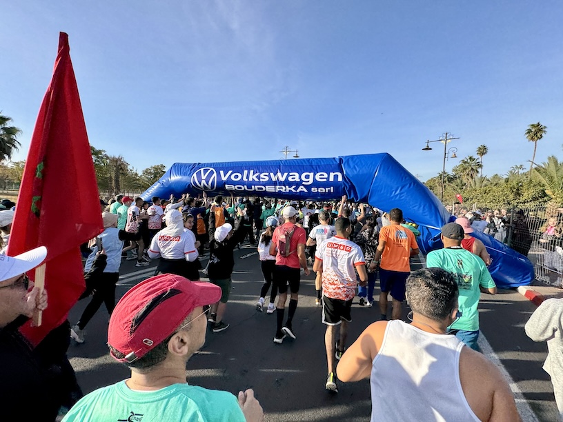 Die Sponsoren hatten Ihre eigenen, mit Luft aufgeblasenen, Tore mitgebracht. Das Tor von Volkswagen hatte aber bereits den Geist aufgegeben, so dass wir uns unten drunter durch mogeln mussten. Nach 500 Metern bogen wir nach links in den Boulevard Mohammed VI. ab und waren dem größten Trubel entlaufen. Das Läuferfeld konnte sich gut sortieren, nicht zuletzt auch durch die breiten Straßen und Fußwege. Ich kam gut in den Lauf rein. Es war noch kühl, auch wenn die Sonne von vorne bereits ordentlich an Kraft gewonnen hatte. Dadurch, dass es keine zeitliche Einordnung durch Pacer gab, war das Läuferfeld komplett durchmischt und man musste permanent schauen, dass man jegliche Überholmöglichkeiten auch nutzte. Ich lief streckenweise nicht auf der Straße, sondern auf dem daneben befindlichen Fußweg. Dadurch kam ich besser in ein gleichmäßiges Lauftempo.