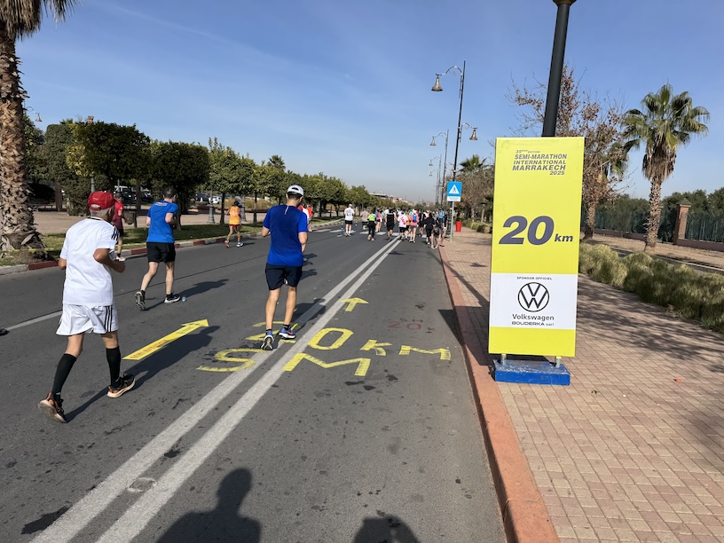 Ich musste jetzt immer mehr Schritt gehen. Mein Blick ging immer wieder zur Uhr. Tick tack, tick tack. Die Zeit verstrich und gefühlt nahm es kein Ende. Bei Kilometer 18 hatten wir wieder den Boulevard Mohammed VI. erreicht, der uns bis an die Avenue Prince Moulay Rachid, der Ziellinie, führen sollte. Bei Kilometer 19 gab es die erwähnte Zeitmessung und kurz vor einem Kreisverkehr, in dem die Marathonläufer abbogen, eine weitere Wasserstelle. Der Gedanke kam auf, wie schlimm es jetzt wäre, noch weitere 23 Kilometer laufen zu müssen. Aber jetzt war es für mich nicht mehr weit und ich biss mich weiter durch. Dann stand am Straßenrand ein großes gelbes 20 km-Schild. Nun war es fast geschafft.