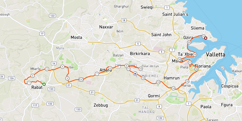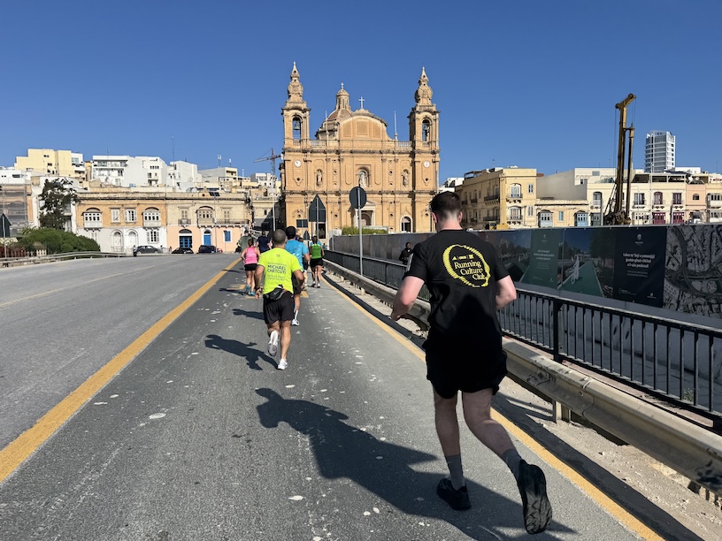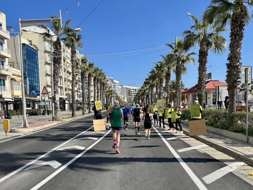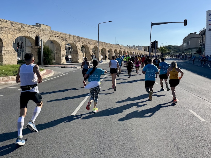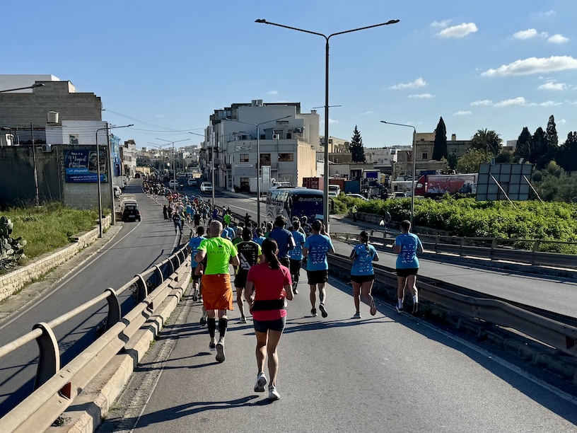 Von Attard aus ging es direkt über in den nächsten Ort Birkirkara – die Grenzen sind hier fließend. Hier liefen wir für einen Kilometer entlang eines neuen Gewerbegebiets und auf gleicher Strecke nach einem Wendepunkt wieder zurück auf die Hauptstraße, die zur Küste führte. Es folgte erneut eine Verpflegungsstelle sowie der schöne Blick zum Aquädukt, bevor wir scharf nach links auf die abfallende Küstenstraße abbiegen mussten, um weiter an Höhe zu verlieren.