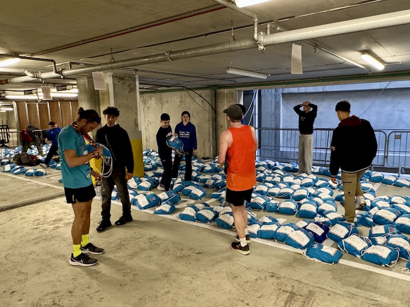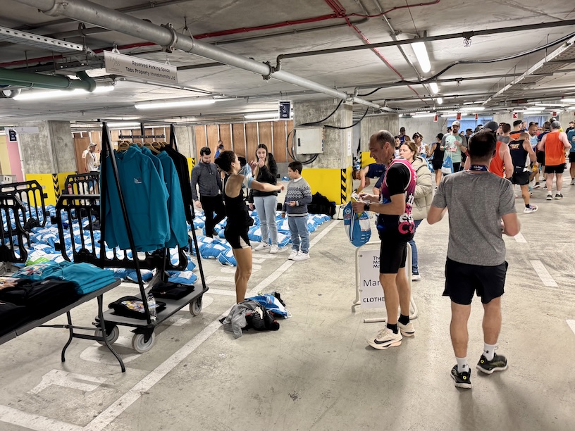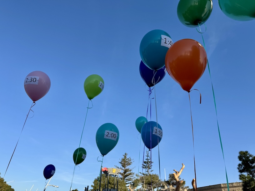 Dann bereitete ich mich auf den Lauf vor. Meinen Beutel konnte ich bei den zahlreichen DHL-Wagen abgeben, die nach Startnummern gekennzeichnet waren. Gut, dass es ein System gab. Die Pacer fand ich zunächst nicht, wohl aber deren Luftballons, die an einem Zaun befestigt waren. Dann zeigten sich die 1:50-Pacer und ich sortierte mich hinter ihnen ein.