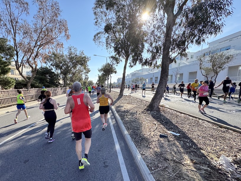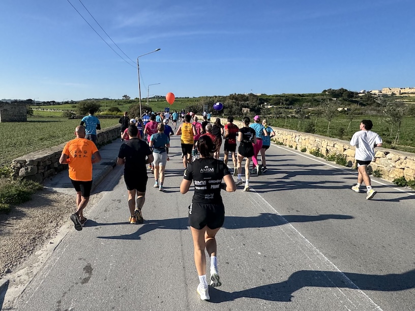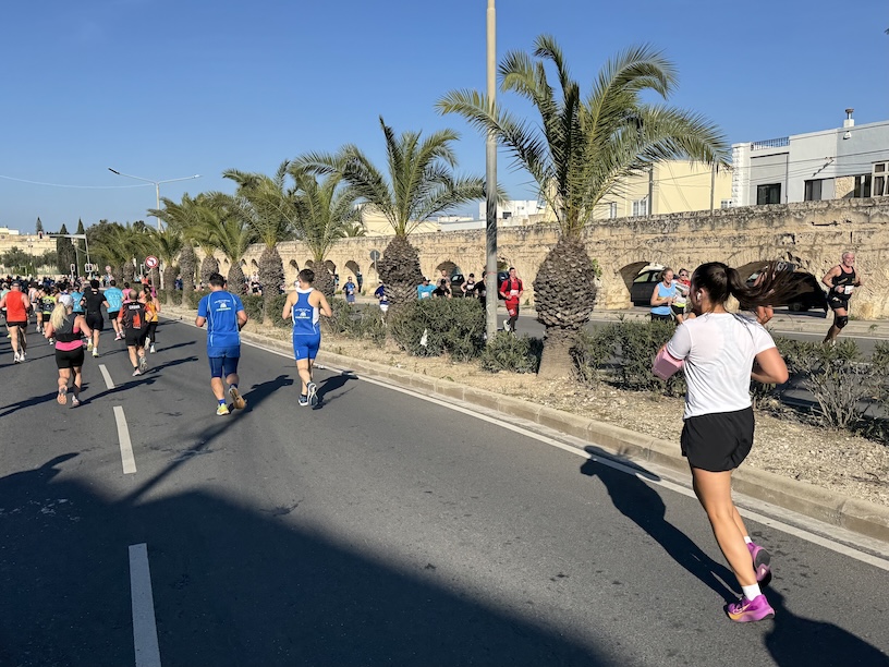 Mdina, die alte Festungsstadt, lag schnell rechts von uns und links erstreckte sich Rabat, die Neustadt. Wir liefen aus der Stadt heraus und verloren rasch an Höhe. Rechts von uns erstreckte sich ein Tal, welches wir nun umrundeten. Bei Kilometer 2 waren wir auf der anderen Seite des Tals angekommen und hatten einen großartigen Blick auf Mdina mit seiner markanten Kirche und den Bastionsanlagen. Hier war die Straße nun auch breiter und man konnte sehr gut überholen und sich überhaupt erst einmal „freischwimmen“. Das Tempo hielt ich aber trotz des Höhenverlustes bei rund 5:10 min/km konstant. Eine Läuferin, die ebenfalls gleichmäßig unterwegs war, nutzte ich als Maßstab meines Tempos.