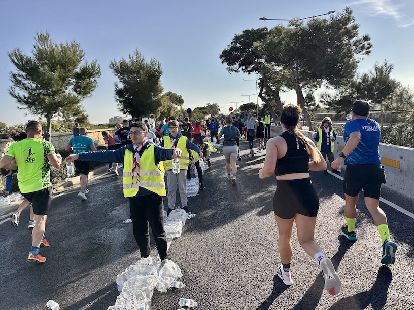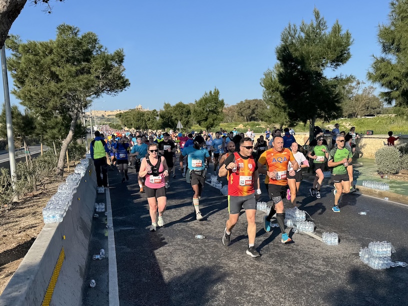 Bei Kilometer 4 erreichten wir den kleinen Ort Ta’Quali, streiften diesen aber nur, um über die alte Landstraße Richtung Hauptstraße, der Triq l-Imdina, zu laufen. Hier angekommen, mussten wir nach links abbiegen und fanden uns auf den neu ausgebauten 2 Spuren einer 4-spurigen Landstraße wieder. Der Asphalt war noch schön schwarz, was wir merkten, da es durch die Sonne direkt wärmer wurde. Wir hatten aber in doppelter Hinsicht Glück. Zum einen wachsen auf Malta überall Bäume und die Straßen sind meist mit alten knorrigen Bäumen „bewaldet“ und spenden zumindest abschnittsweise Schatten, zum anderen kam kurz nach Kilometer 5 die erste Verpflegungsstation, bei der wir reichlich Wasser bekamen.