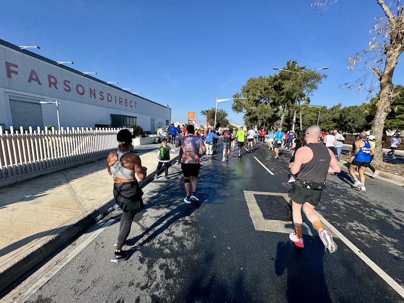 Bei Kilometer 14 erreichten wir Marsa, eine Gemeinde am Wasser, von dem wir aber nichts sahen. Hier gab es erneut eine Verpflegungsstelle und ich tankte ordentlich nach. Mir ging es gut, war allerdings nicht mehr so flott wie zu Beginn unterwegs. Das ewige hoch und runter der Brücken, hatte mich ein wenig Power gekostet. Und auch die direkte Sonneneinstrahlung auf dem unbeschatteten Asphalt tat sein Übriges.