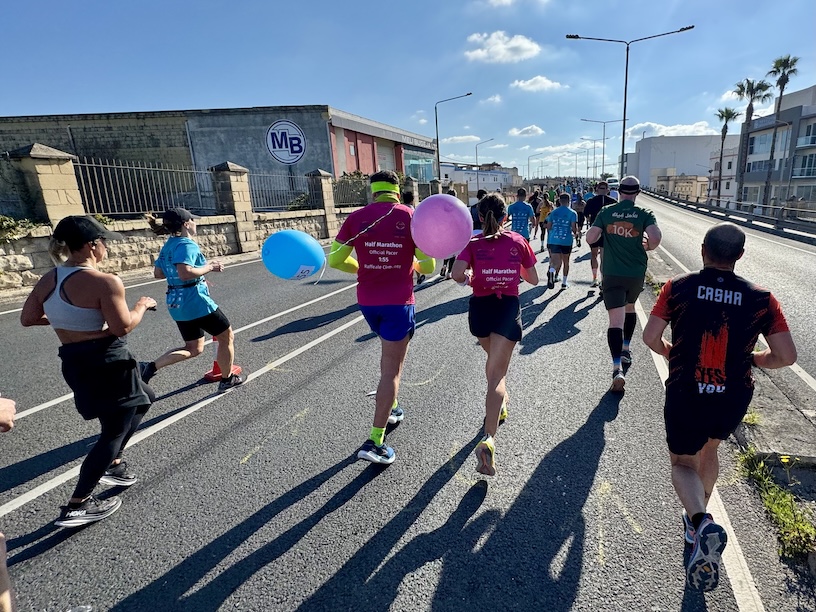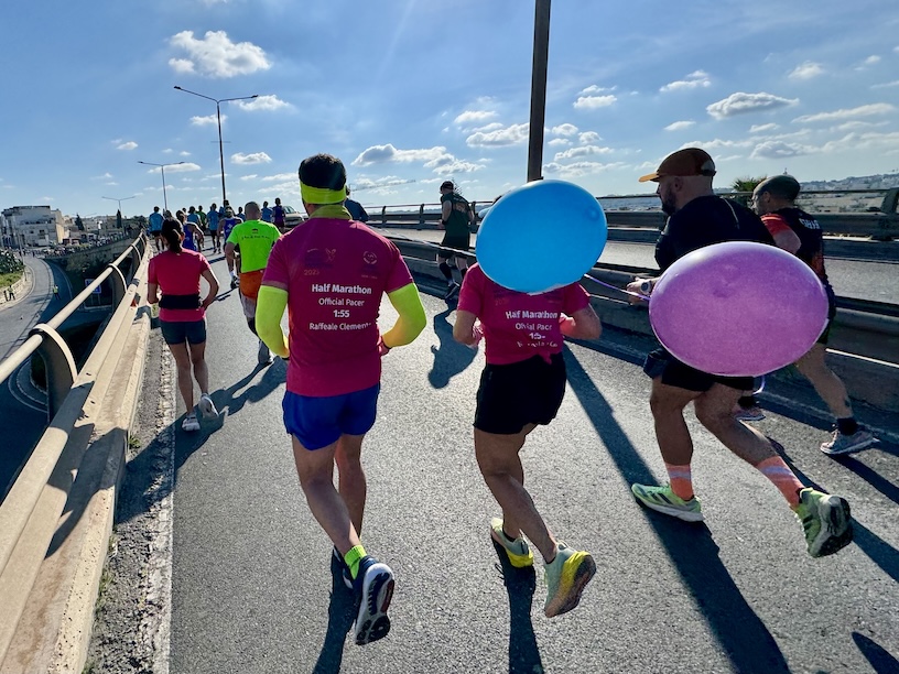 Kurz vor Kilometer 13, in Qormi, überholten mich nun die 1:55-Pacer. Meine 1:50-Pacer hatte ich bei meinen Trinkpausen ziehen lassen müssen. Der Blick auf die Uhr zeigte mir aber, dass ich recht gut in der Zeit lag. 1:50 Stunden wäre nicht zu realisieren, das war mir klar. Ziel war aber, deutlich unter 2 Stunden zu bleiben. Also nutzte ich die beiden Luftballonträger und hängte mich an diese dran. Hier verblieb ich jedoch nicht lange, denn ich konnte doch noch einmal ein wenig beschleunigen.