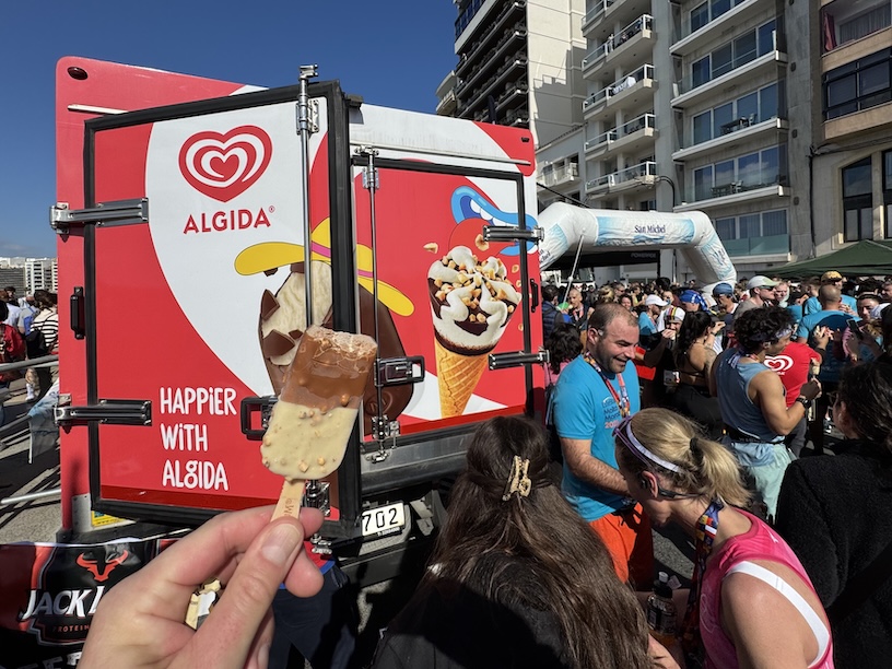 Im Ziel gab es Getränke und reichlich Eis am Stiel. Eine herrliche Abkühlung nach dem Lauf. Und dann? Dann merkte ich plötzlich meinen linken Fuß. Die ganze Zeit war Stille. Jetzt, nachdem ich ein wenig pausiert hatte, pulsierte es unter dem Ballen. Meine Blase hatte sich wieder zum Leben erweckt. Ich sollte noch den ganzen Tag Probleme mit dem Laufen haben.