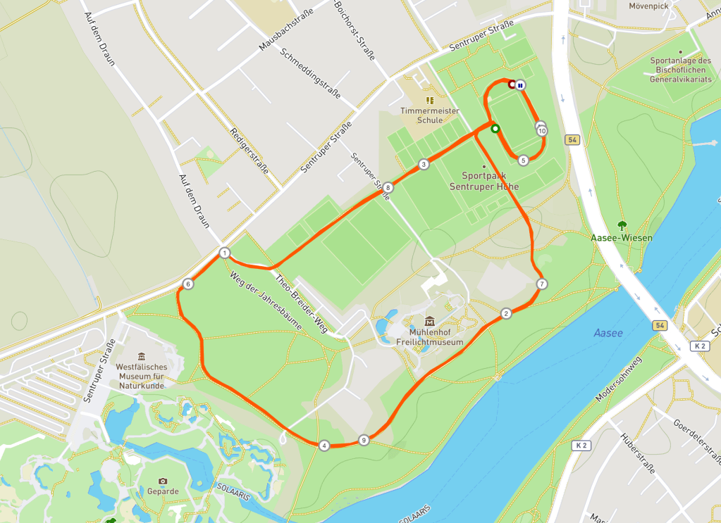 Um punkt 15 Uhr fiel der Startschuss auf der Laufbahn des Sportparks Sentruper Höhe. Zunächst ging es eine Runde über die Sportbahn, dann bogen wir in den Sportpark ab und liefen Richtung Planetarium und Zoo. Nach knapp 900 Metern erreichten wir den Theo-Breider-Weg, den wir nach rechts zur Sentruper Straße weiterliefen. Die Sentruper Straße streiften wir nur kurz, da wir vor dem Planetarium nach links einbogen, um Richtung Aasee weiterzulaufen.