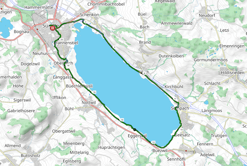 Durch die Unterstadt gelaufen, erreichten wir nach knapp 500 Metern die Münsterstraße, die uns aus Sursee hinaus Richtung Sempachersee führte. Auch hier ging es noch stetig bergan. Nach rund eineinhalb Kilometern hatten wir unseren Peak erreicht und überquerten die Autobahn 2 Richtung Luzern. Von der Autobahnbrücke aus hatten wir auch einen guten Blick über den Sempachersee.