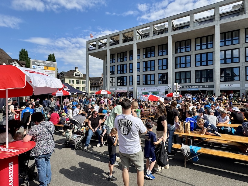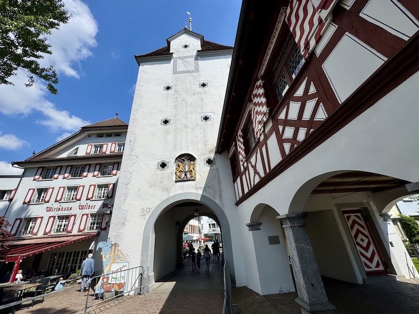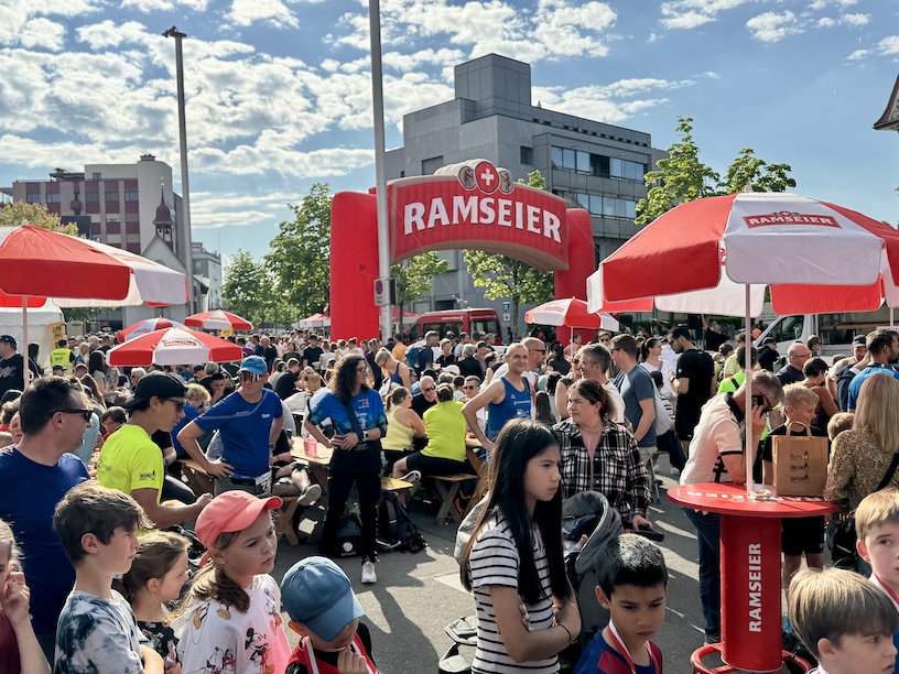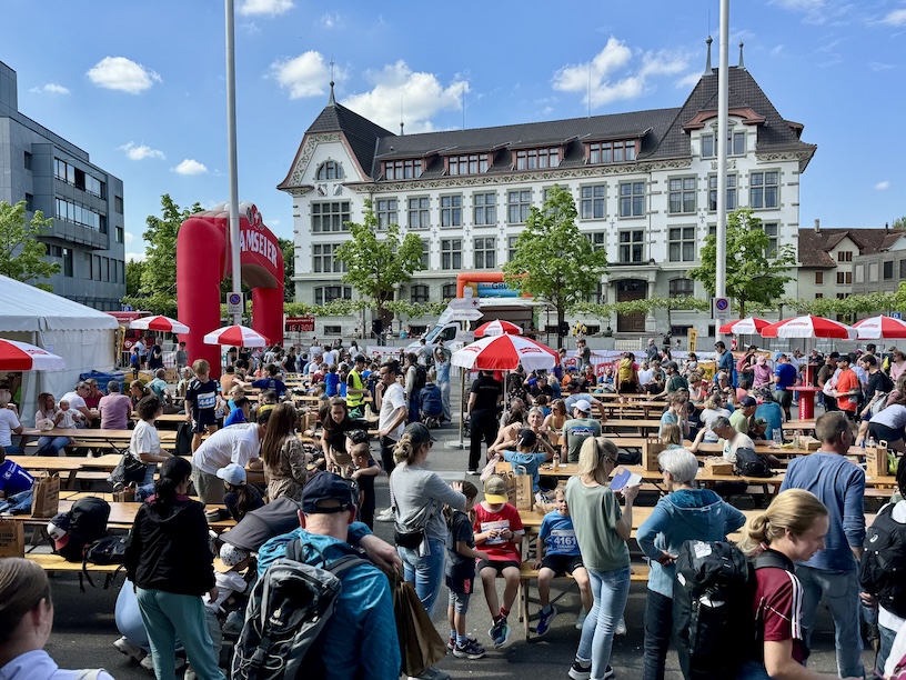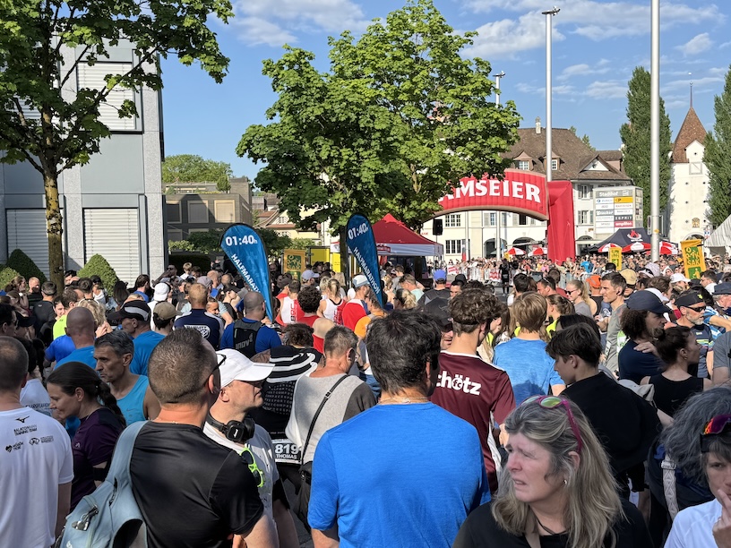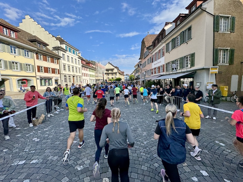 Die ersten Wohnhäuser der Stadt kamen in Sicht, noch ein paar Kurven und verwinkelte Gassen und dann kam der Zieleinlauf direkt durch die Unterstadt. Die Straßen waren voll und man wurde angefeuert doch weiterzulaufen, aber das wäre nicht gegangen. Man muss wissen, wann es besser zu Ende ist. Der Ramseier-Torbogen kam in Sicht und ich beendete meinen Lauf nach 2 Stunden, 16 Minuten und 21 Sekunden. Herzlichen Glückwunsch – Bestzeit von hinten gerechnet. Das Ergebnis war nicht das, was ich mir errechnet hatte. Wäre ich normal, mit immer weniger Geschwindigkeit, bis zum Schluss hin weitergelaufen, hätte ich sicher eine 1:53 Stunden-Zeit realisiert.