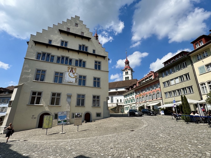 Um 18:05 Uhr ging es dann los. Vom Startschuss bekam ich nichts mit, wohl aber vom Geraune und dem sich automatisch immer schneller bewegenden Läuferfeld. Die Bahnhofstraße war nicht sonderlich breit, so dass sich das Läuferfeld sehr nah beieinander um den Martignyplatz schlängeln musste. Die Bahnhofstraße führte uns nun durch das Untertor in die Unterstadt, was insofern ein Widerspruch in sich war, als das es in die Unterstadt deutlich nach oben ging. Hier in der Unterstadt hatten wir einen schönen Blick auf die St. Georgskirche aus dem 11. Jahrhundert und das exponiert gelegene Rathaus.