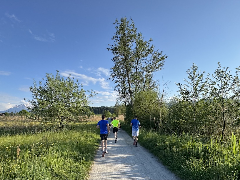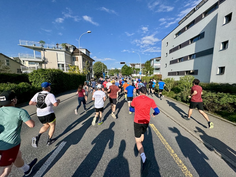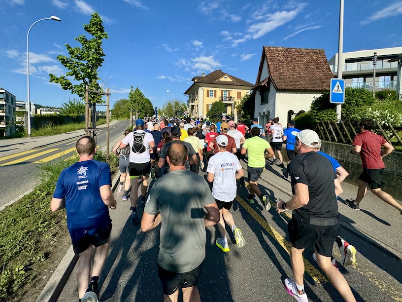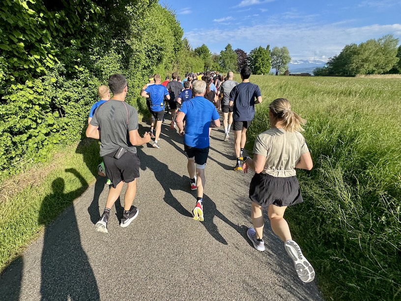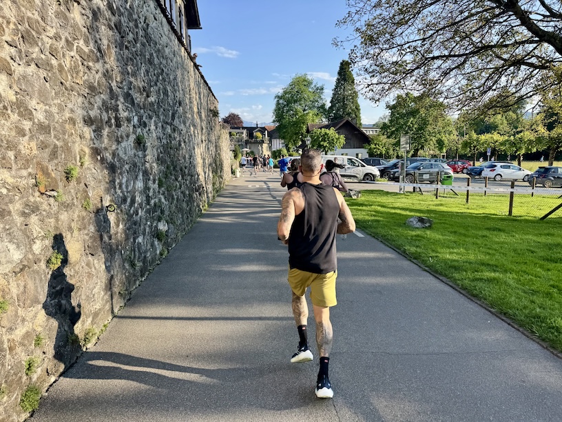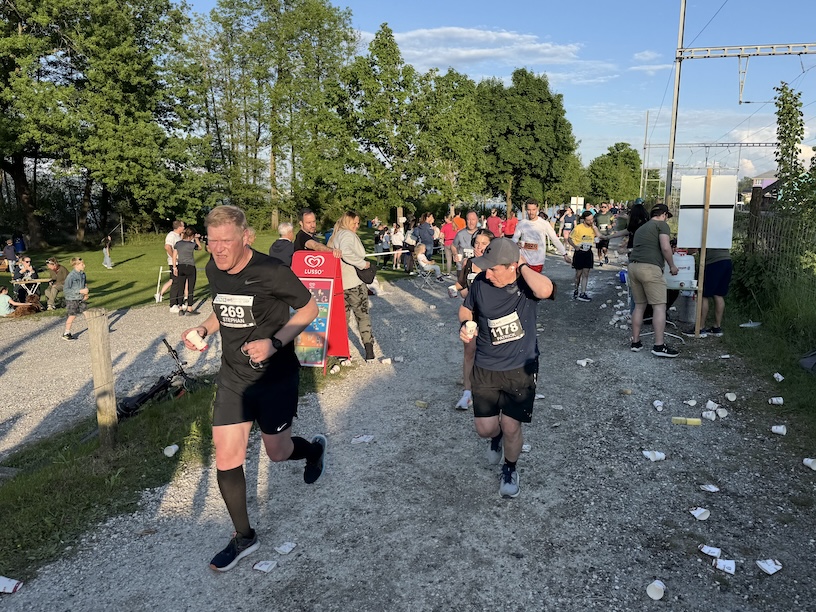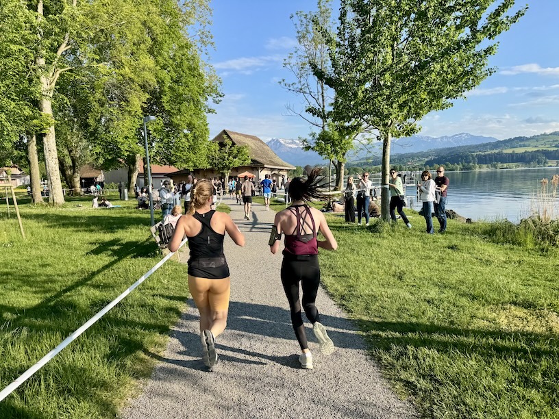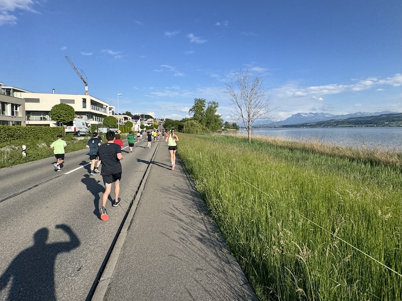 Hier war es nun keine Straße mehr, sondern ein Single-Track-Schotterweg. Die Menschen saßen auf den Rasenflächen und schauten den Läuferinnen und Läufern zu. Als wollten Sie uns zusätzlich Quälen, gab es vielerorts kühle Getränke und leckeres Grillgut. Das war eine ziemliche Herausforderung für mich. Aber die Qual dauerte nicht lang an und schon hatten wir Sempach wieder verlassen und liefen den Uferweg weiter entlang.