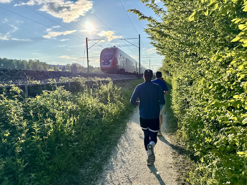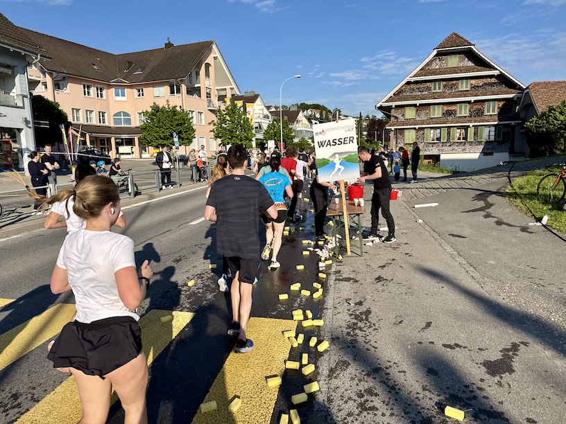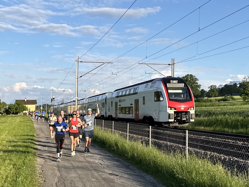 Unser Weg führte uns nun entlang der Bahnstrecke. Immer mal wieder kamen die ICs der SBB vorbei, die kurz mal anhupten und dann mit ihrem Fahrtwind für „Erfrischung“ sorgten. Bei der Gemeinde Nottwill gab es eine weitere Verpflegungsstation, die ich dringend in Anspruch nehmen musste. Ich tankte ordentlich Wasser, Isostar und bunkerte neue nasse Schwämme. Aufbauend war, ich war nicht allein mit meiner Grundkonstitution.