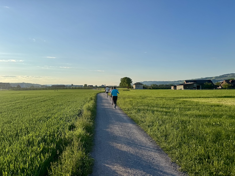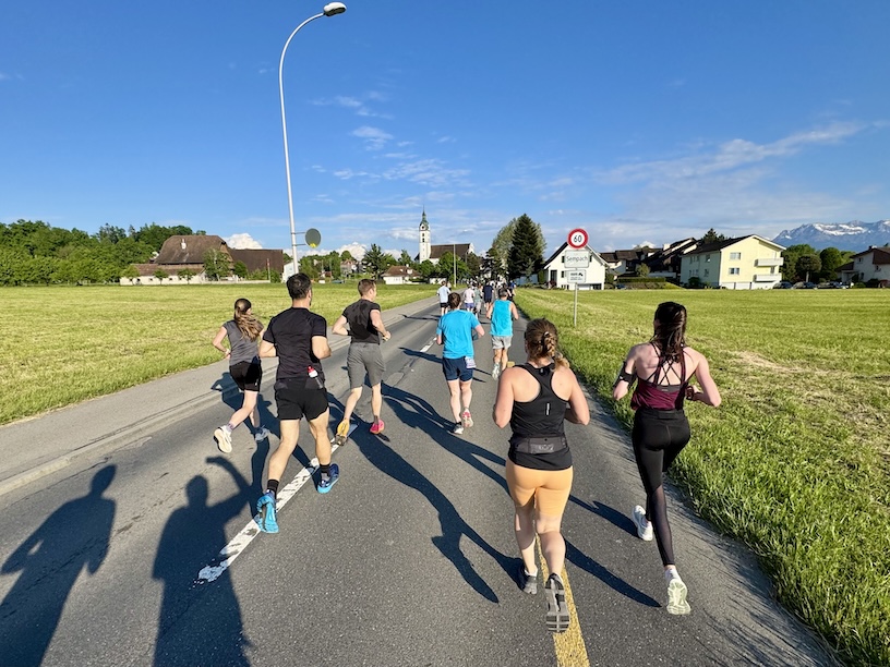 Dann kamen wir aufs freie Feld und der Weiler Eich kam ins Blickfeld. Bei Kilometer 6 hatten wir den kleinen Ort erreicht. Hier bekamen wir nun einen schönen Vorgeschmack auf das, was uns auf dem Rückweg erwarten sollte. In den Bergen rund um den Sempachersee staute sich die Gewitterluft, über dem See herrschte Windstille und die Sonne knallte in den feuchtwarmen Kessel. Vielversprechende Aussichten auf die zweite Halbzeit des Laufes waren dies.