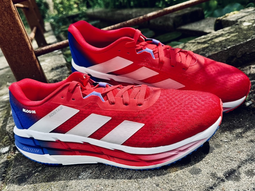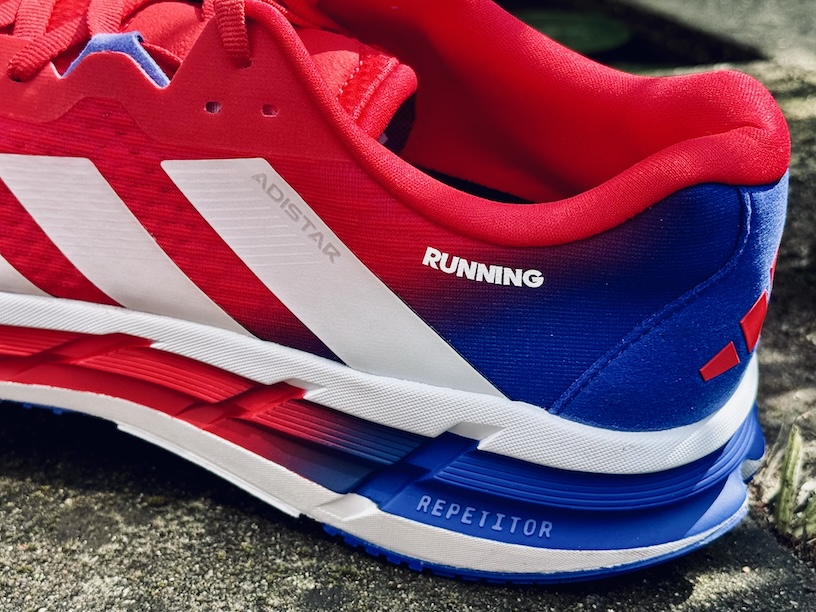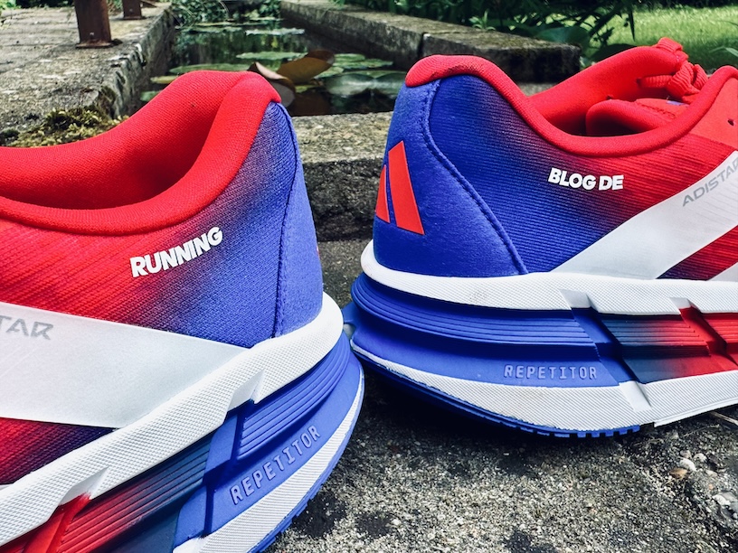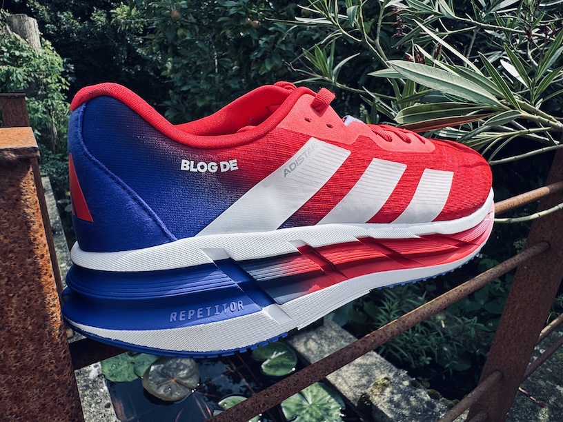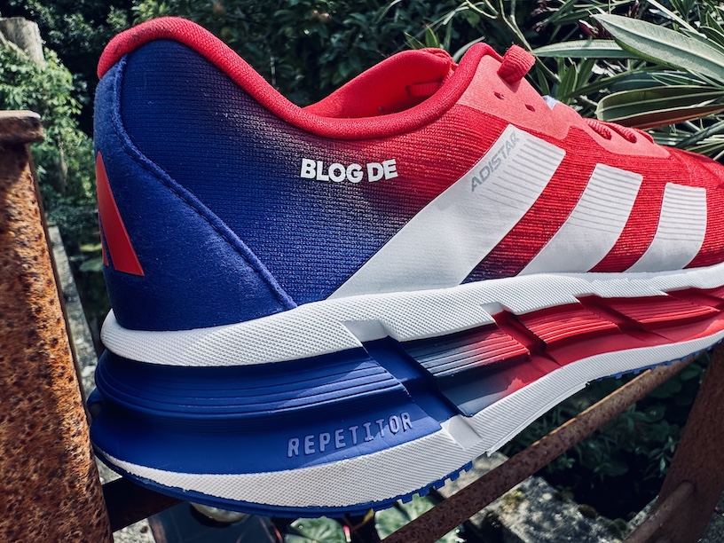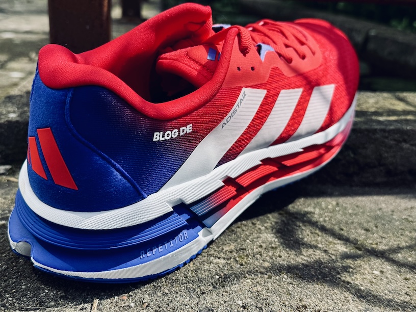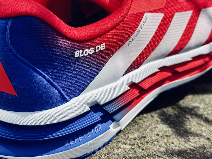 Fangen wir mit dem Hauptaspekt diesmal an. Repetitor 2.0, eine speziell für längere Läufe entwickelte Dual-Density-Zwischensohlen-Technologie, ist hier das Schlagwort, das auch auf dem Schuh selbst prägnant zur Geltung kommt. Der Adistar 3 besteht aus einer weiterentwickelten EVA-Schaumstoff-Zwischensohle, die den weicheren Repetitior-Schaumstoff mit einem festeren Repetitor+-Schaumstoff verbindet. Damit soll erreicht werden, dass Dämpfung genau dort entsteht, wo sie gebraucht wird.