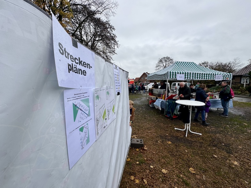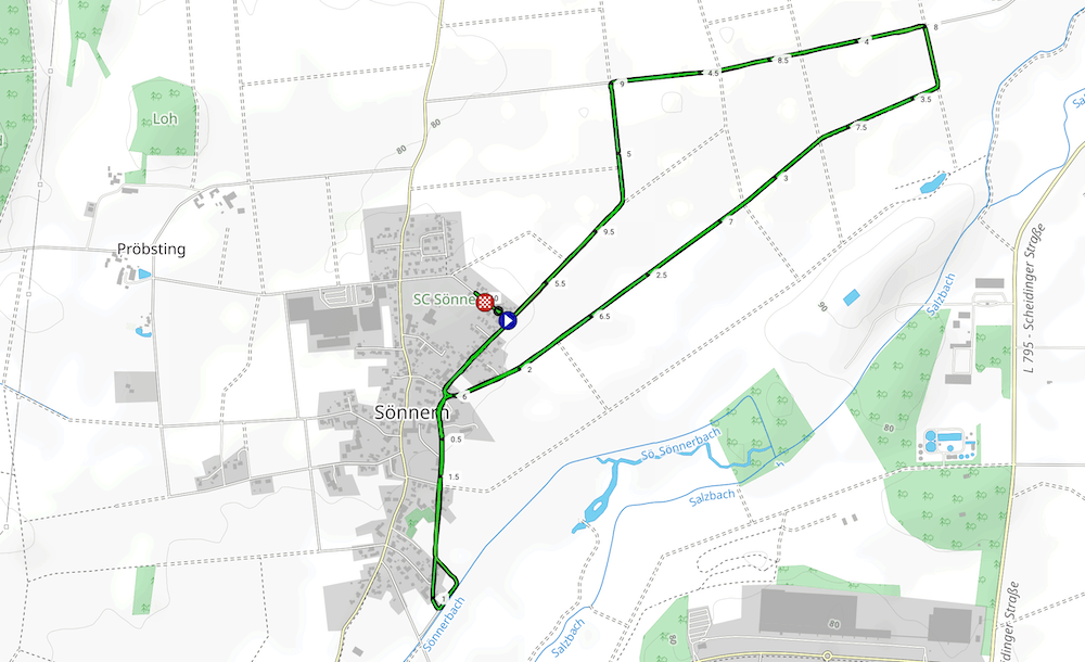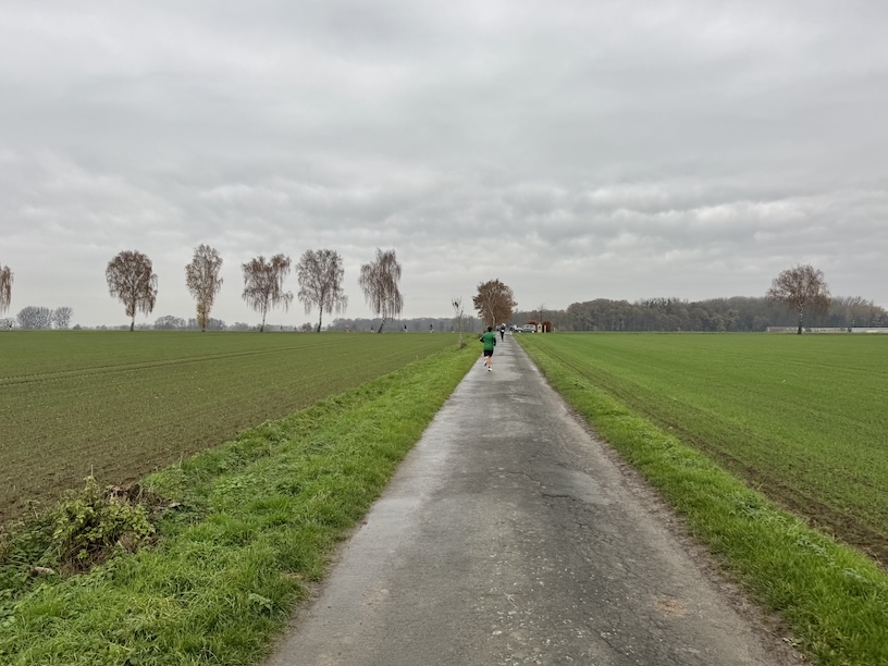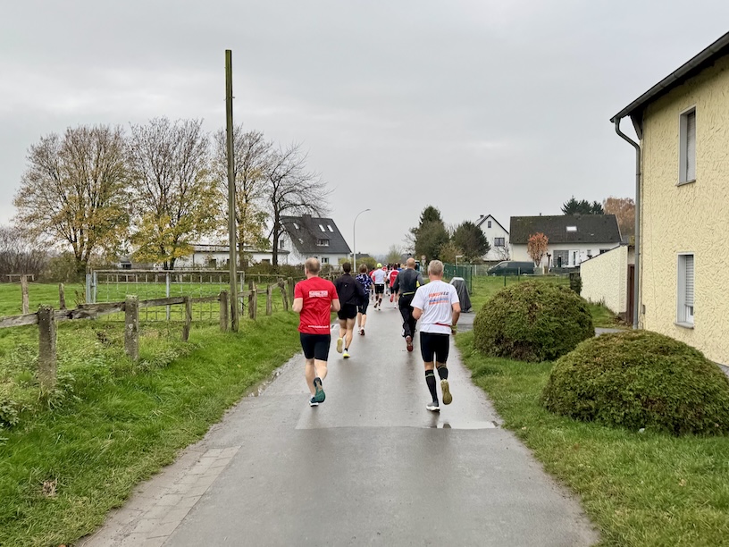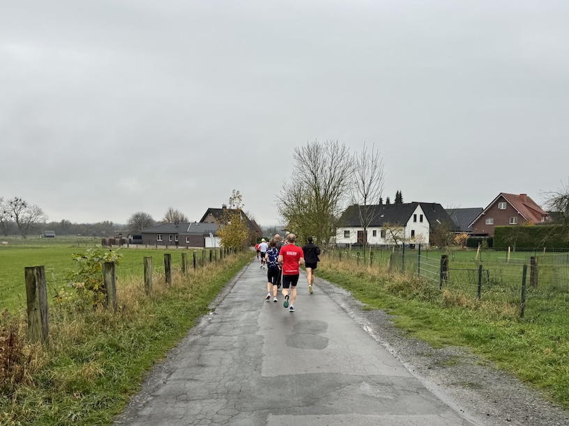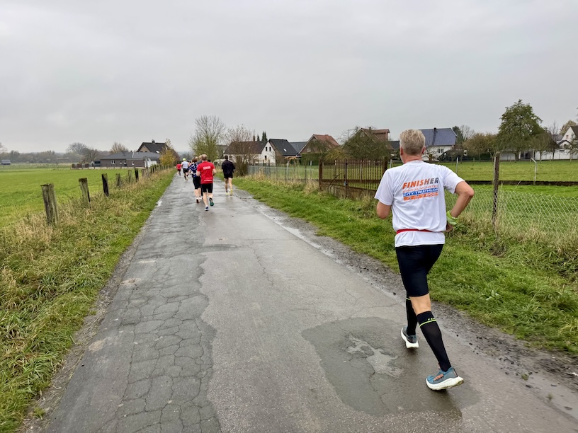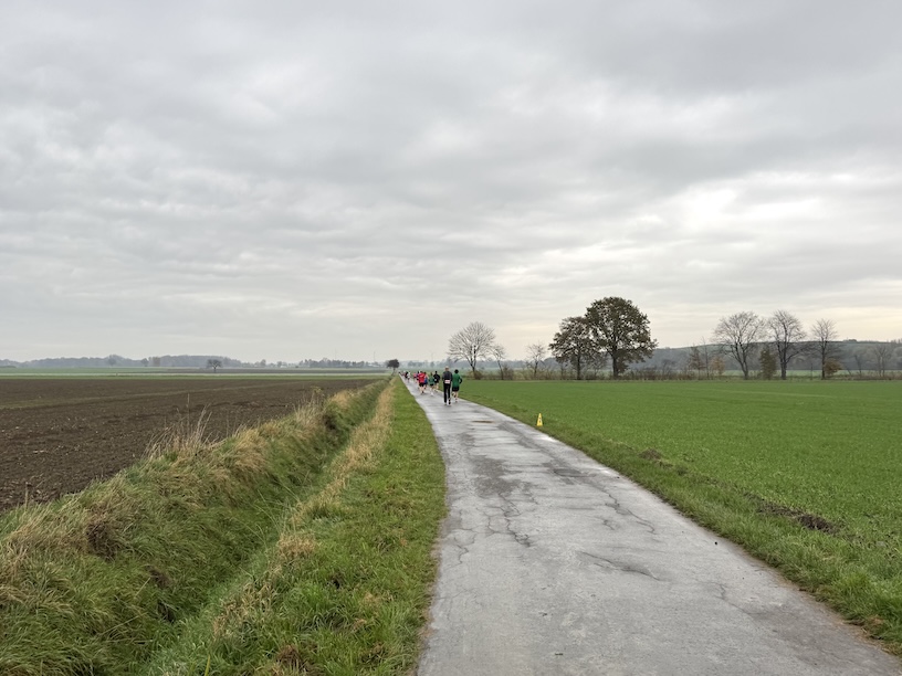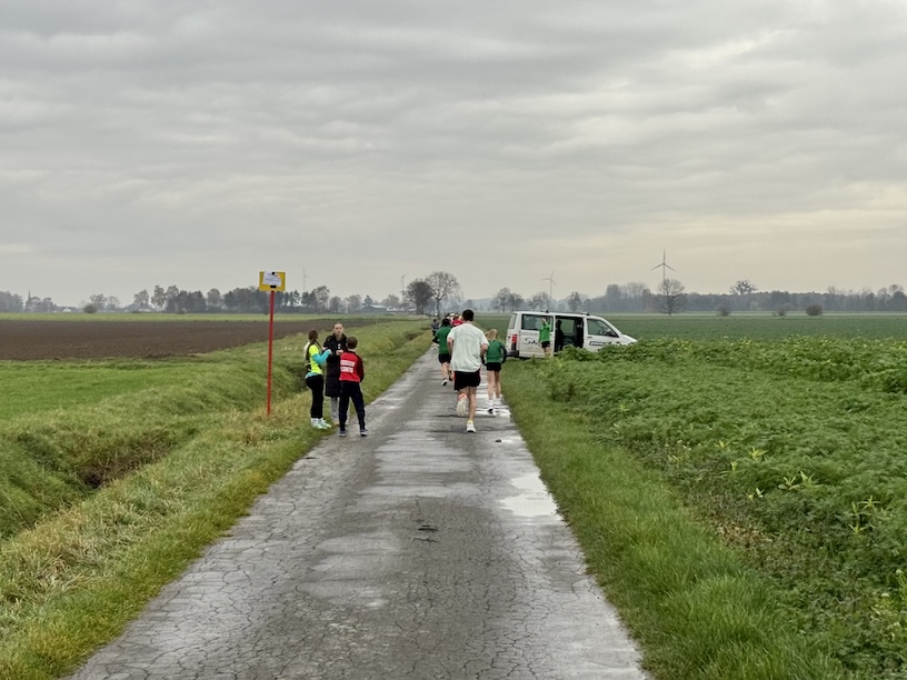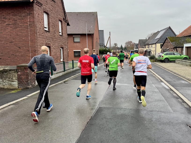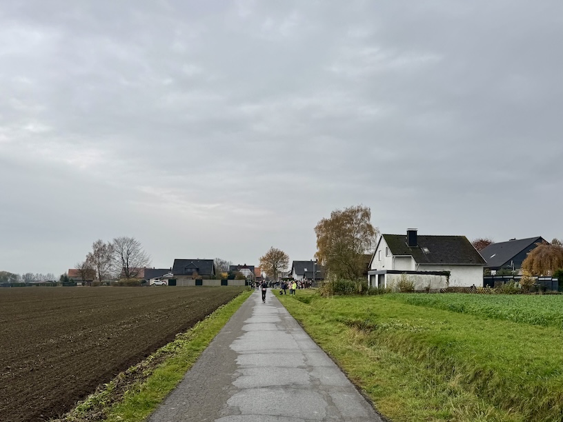 Um Punkt 10 erfolgte der Startschuss und das Feld setzte sich in Bewegung. Kurz nach dem Start bogen wir zunächst nach rechts ab, um über die Feldstraße eine knapp 2 Kilometer lange Schleife zu laufen. Dazu liefen wir aus dem Ort heraus, drehten um einen Bauernhof herum, und liefen zurück Richtung Ort. Kurz vor Erreichen der Ortschaft liefen wir leicht nach rechts weiter in die Niclasstraße, die uns knapp eineinhalb Kilometer durch das Feld, vom Ort weg, führte.
