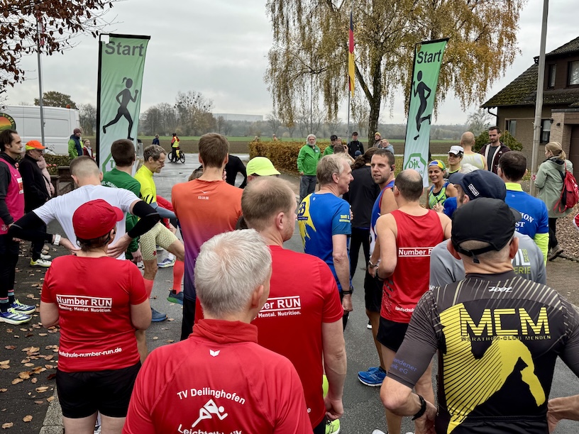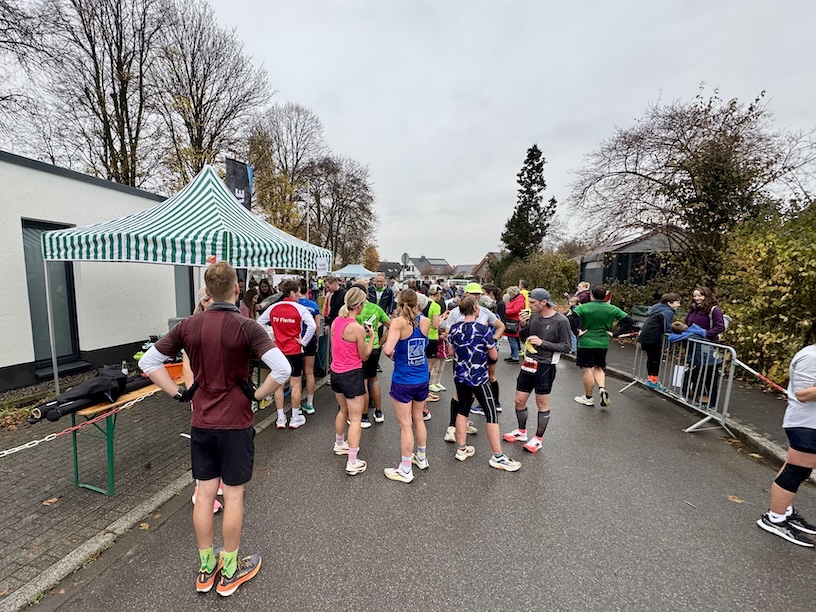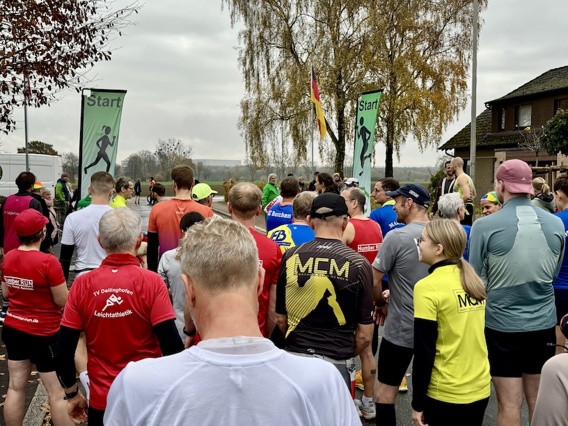 Das Wetter war kalt, wolkig, ja sogar ein wenig neblig und vor allem durch den Wind recht kühl. Kurz vorher hatte es scheinbar geregnet, denn die Straßen waren noch klitschnass. Jetzt war es trocken und es sah auch nicht danach aus, dass noch mehr runterkommen würde. Das war ganz nach meinem Geschmack. Ich lief mich auf der Straße ein, machte ein wenig meine „geliebten“ Dehnübungen und fand mich am Start ein. Das Starterfeld war übersichtlich und ich sortierte mich irgendwo in der Mitte ein.