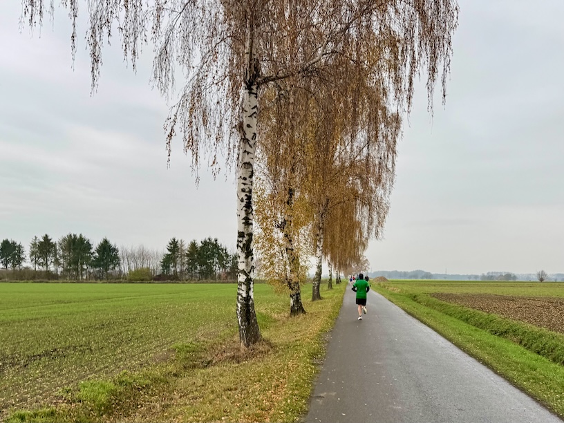 Bei Kilometer 9 überholte mich dann eine ältere Dame und ich dachte so bei mir, wenn ich in dem Alter auch noch so einen Zug draufhätte, dann hätte ich wohl alles richtig gemacht. Ich nutzte ihr Tempo und hängte mich meinerseits dran. Da sie recht zügig unterwegs war, hielt ich ein wenig Abstand – getreu dem Motto „was Du nicht willst, was man Dir tu, da füg auch keinem andren zu“.