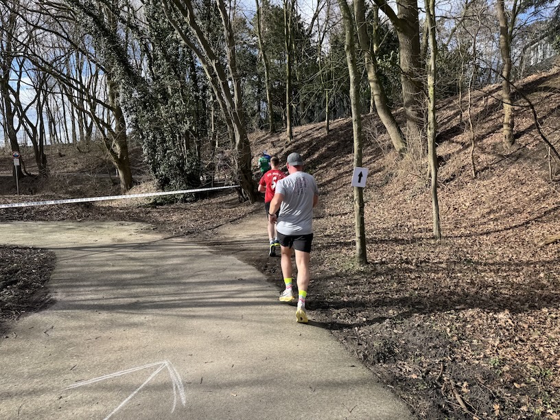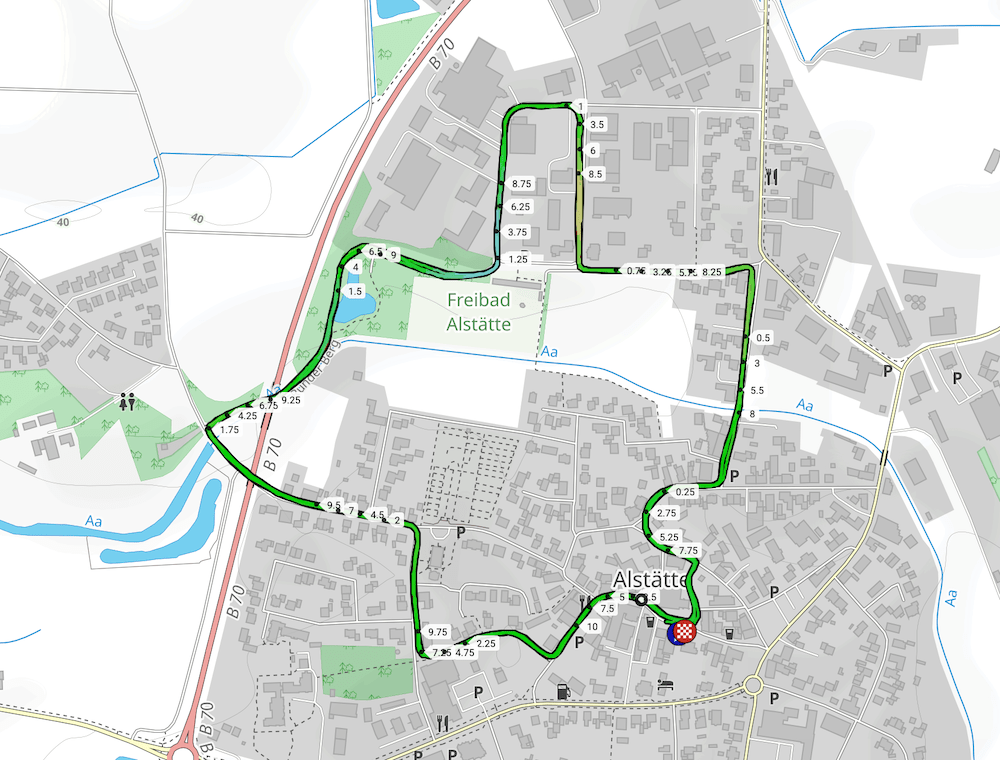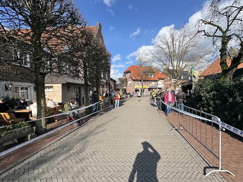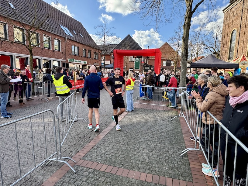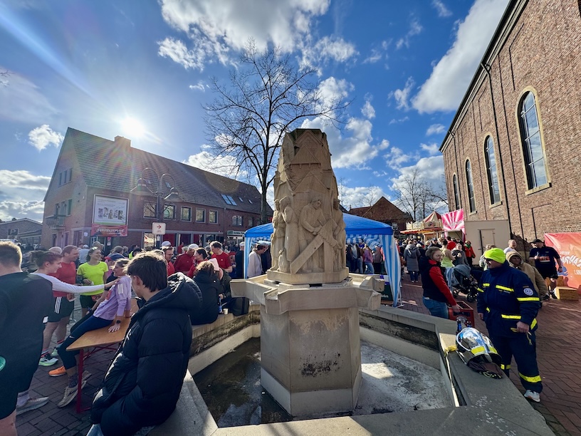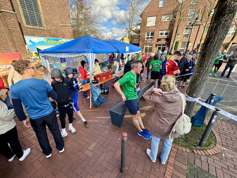 Der Lauf kreuzte die Aa, führte nördlich aus dem Ort heraus, dann rund um ein Gewerbegebiet, in dem es eine ordentliche Steigung gab und dann wieder zurück Richtung Alstätte. Der schönste Streckenabschnitt war sicherlich der Runde Berg – ein kleines Waldstück entlang der Aa, ruhig und landschaftlich richtig schön, bevor es über die Alstätter Friedhofstraße wieder zurück in den Dorfkern ging. Nach rund 2,5 Kilometern Strecke zeigte sich uns hier ein volles Haus und vielen Zuschauer, die die Läuferinnen und Läufer anfeuerten, sorgten für einen kleinen Motivationsschub und die nächste Runde konnte folgen.