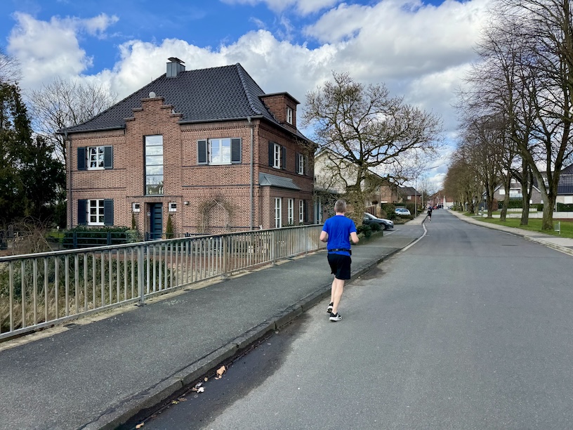 Punkt 14 Uhr fiel der Startschuss. Auf den ersten Metern ging es noch recht eng zu, zumal direkt nach dem Start eine scharfe 90-Grad-Kurve folgte. Dann ging es hinter der Kirche entlang in ein Wohngebiet. Hier konnte sich das Läuferfeld ein wenig entzerren und ich suchte mir einen freien Platz, um vorwärtszukommen. Nach etwa einem Kilometer hatte sich das Feld auseinandergezogen und ich fand langsam meinen Rhythmus.